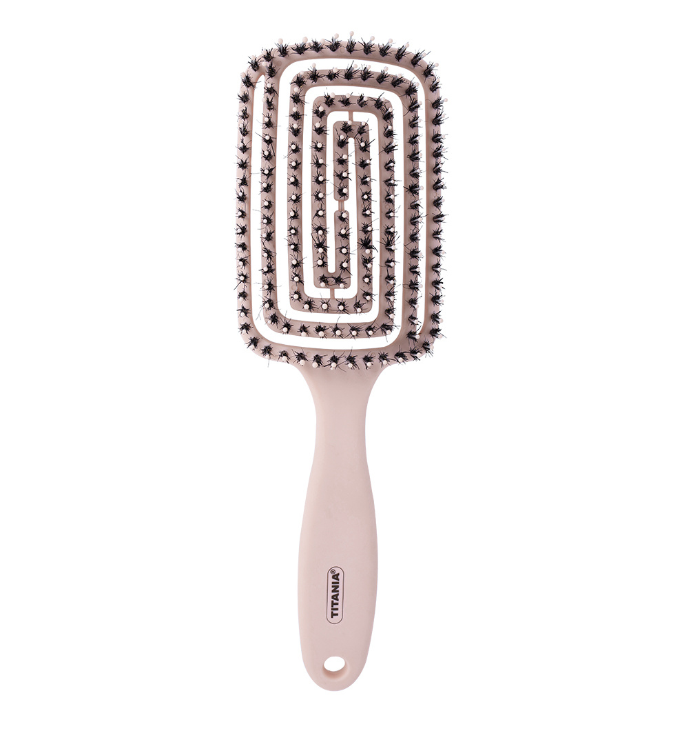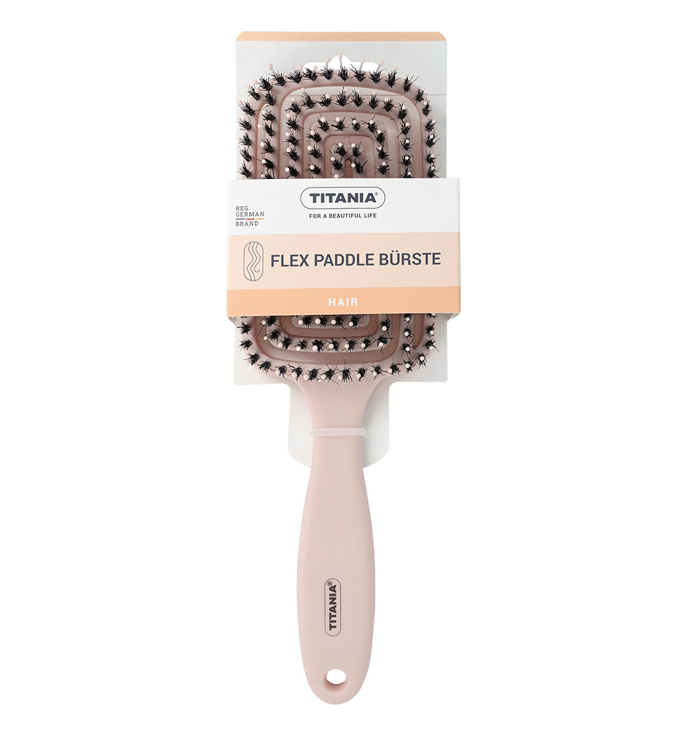 Ο συνδυασμός νάιλον καρφιών και φυσικών τριχών επιτρέπει στη βούρτσα TITANIA Flex Paddle να γλιστράει απαλά σε μακριά μαλλιά.