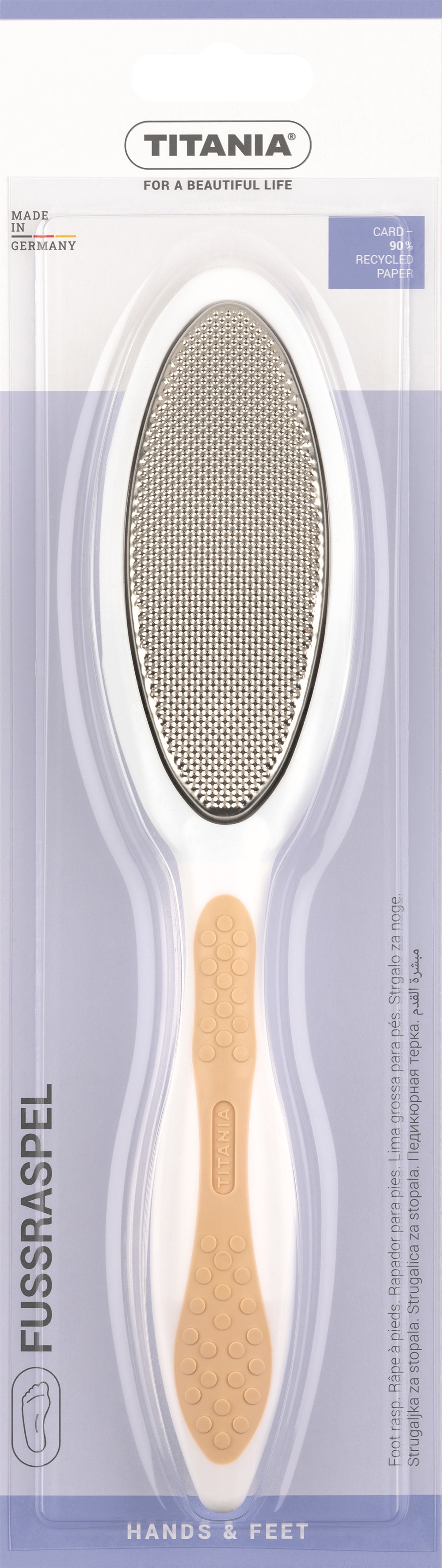 Η εργονομικά διαμορφωμένη ράσπα ποδιών Titania 3041B με απαλή λαβή εξασφαλίζει φιλική προς το δέρμα φροντίδα των ποδιών με τη λειαντική της επιφάνειας και την ανοξείδωτη ράσπα, αφαιρώντας απαλά και σχολαστικά τους κάλους και τους κερατοειδείς χόνδρους.